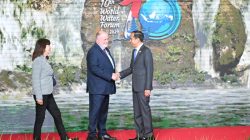 Tampak di tengah panggung adalah latar belakang air terjun yang memperlihatkan tulisan “World Water Forum ke-10”, dengan gambaran pemandangan alam yang memukau.