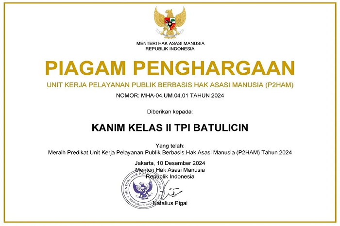 Kabarkalimantan.id — Kantor Imigrasi Kelas II TPI Batulicin Kabupaten Tanah Bumbu Provinsi Kalimantan Selatan, meraih penghargaan dari Menteri Hak Asasi Manusia RI, Natalius Pigai, terkait Unit Kerja Pelayanan Publik Berbasis Hak Asasi Manusia (P2HAM) Tahun 2024. Penghargaan ini menjadi bukti nyata pengakuan atas dedikasi dan komitmen Kantor Imigrasi Batulicin dalam menyelenggarakan pelayanan publik yang berbasis pada prinsip-prinsip Hak Asasi Manusia (HAM).