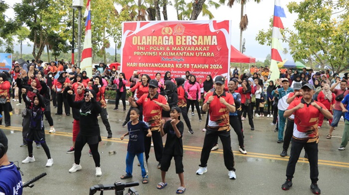 KabarKalimantan.id — Dalam rangkaian Hari Ulang Tahun Bhayangkara ke-78, Kepolisian Daerah Kalimantan Utara (Polda Kaltara) menggelar kegiatan Jalan Santai dan Senam Bersama yang dimulai di depan Hotel Pangeran Khar, Ahad (30/6) Pagi.