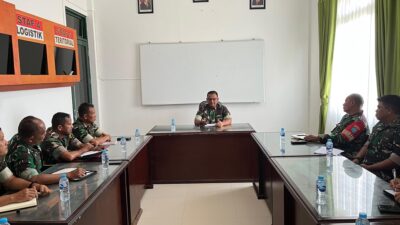 Dandim 1210/Landak, Letkol Kav Andy Setiyo Untoro evaluasi program kerja bersama seluruh perwira dan Danramil tingkatkan efektivitas tugas.